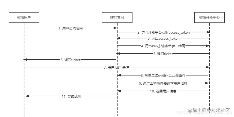 - 用户扫码关注后,我们就会收到微信的回调事件,我们只需要处理这个回调事件就知道这个用户登录了。然后获取该用户的基本信息完成登录。