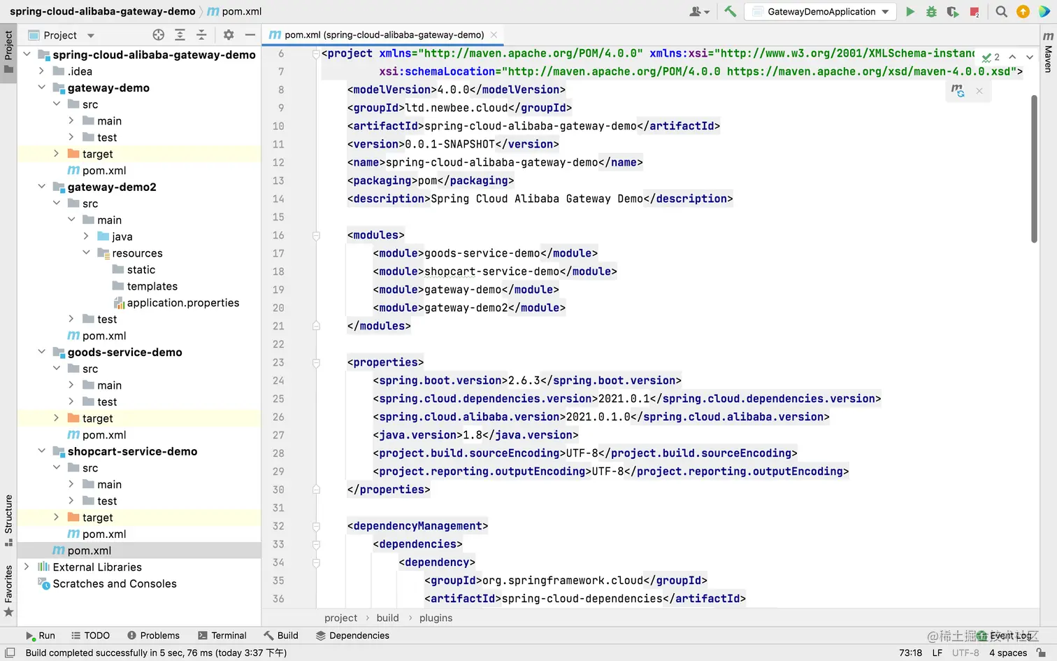 首先,修改项目名称为 spring-cloud-alibaba-gateway-demo,然后把各个 Module 中 pom.xml 文件的 artifactId 修改为 spring-cloud-alibaba-gateway-demo。