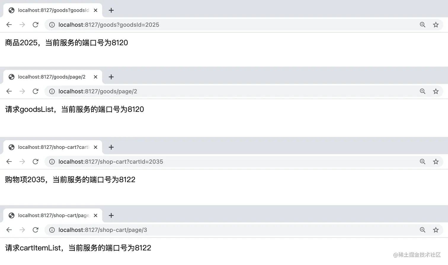 依次启动 gateway-demo、goods-service-demo 和 shopcart-service-demo 这 3 个项目。启动成功后,打开浏览器验证网关的功能,在地址栏中依次输入如下地址进行测试。
