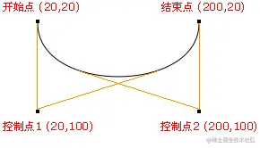 提示:三次贝塞尔曲线需要三个点。前两个点是用于三次贝塞尔计算中的控制点,第三个点是曲线的结束点。曲线的开始点是当前路径中最后一个点。如果路径不存在,那么请使用beginPath() 和 moveTo() 方法来定义开始点。