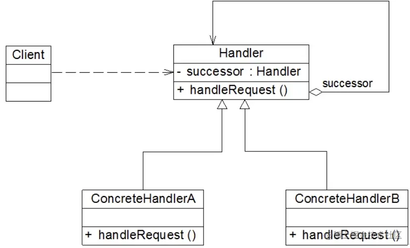 ● Handler(抽象处理者):它定义了一个处理请求的接口,一般设计为抽象类,由于不同的具体处理者处理请求的方式不同,因此在其中定义了抽象请求处理方法。因为每一个处理者的下家还是一个处理者,因此在抽象处理者中定义了一个抽象处理者类型的对象(如结构图中的successor),作为其对下家的引用。通过该引用,处理者可以连成一条链。