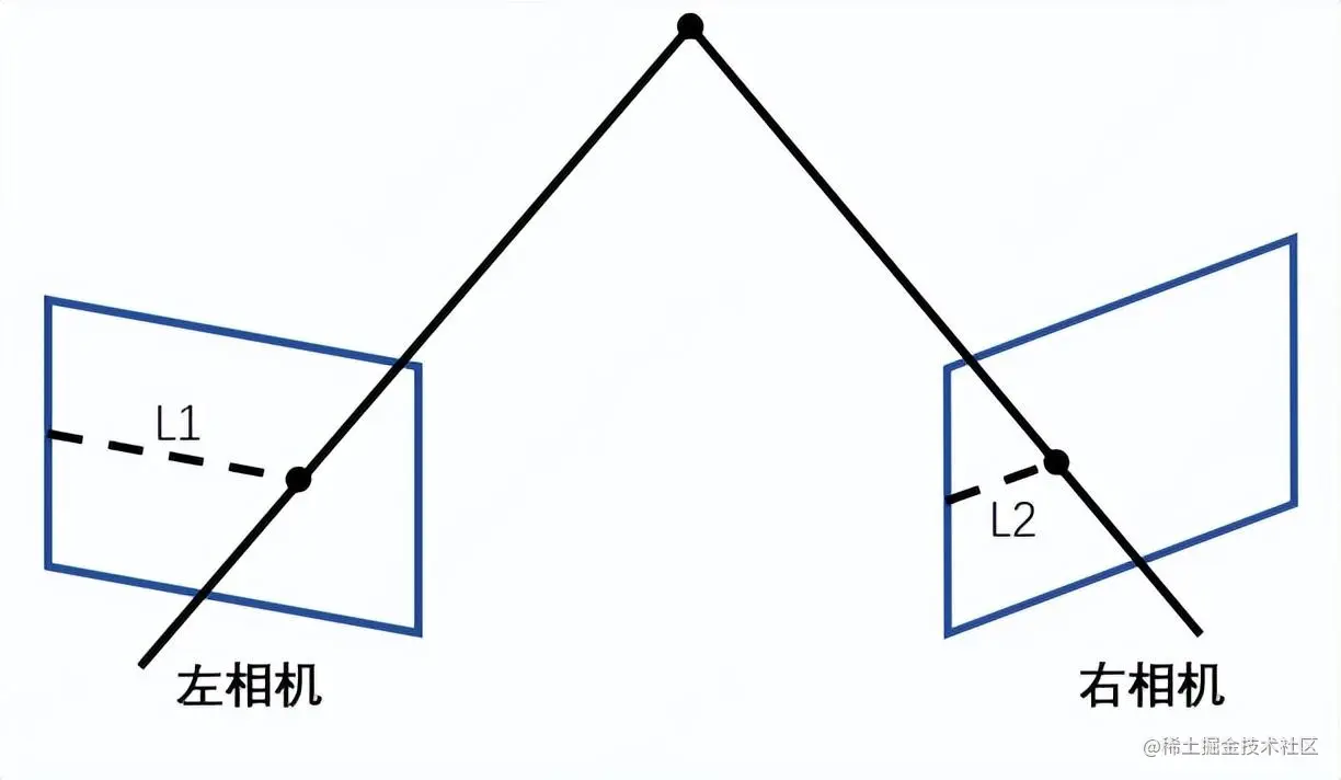 观测点在一个相机和在另外一个相机上的成像是有明显可区分性的,二者的观察差异(L1和L2)形成了视差,进而可形成深度信息。