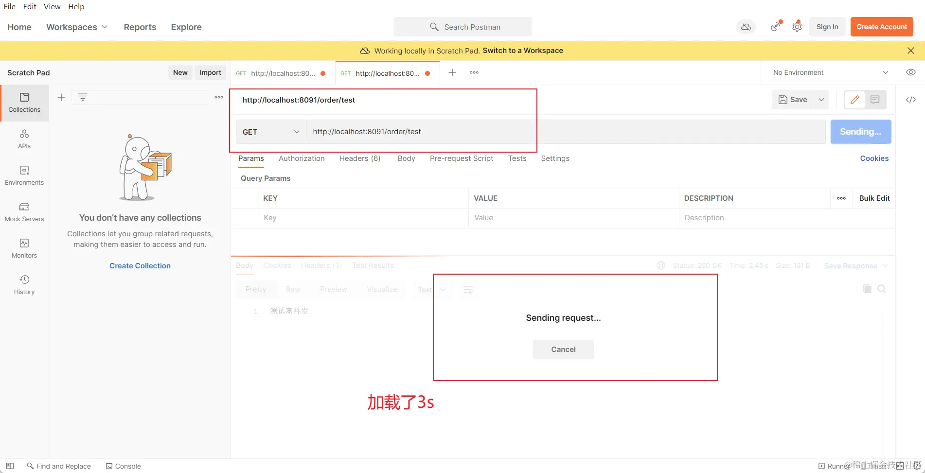 这时候再访问我们的测试方法.看看他是不是会受到订单方法阻塞而受到影响 http://localhost:8091/order/test