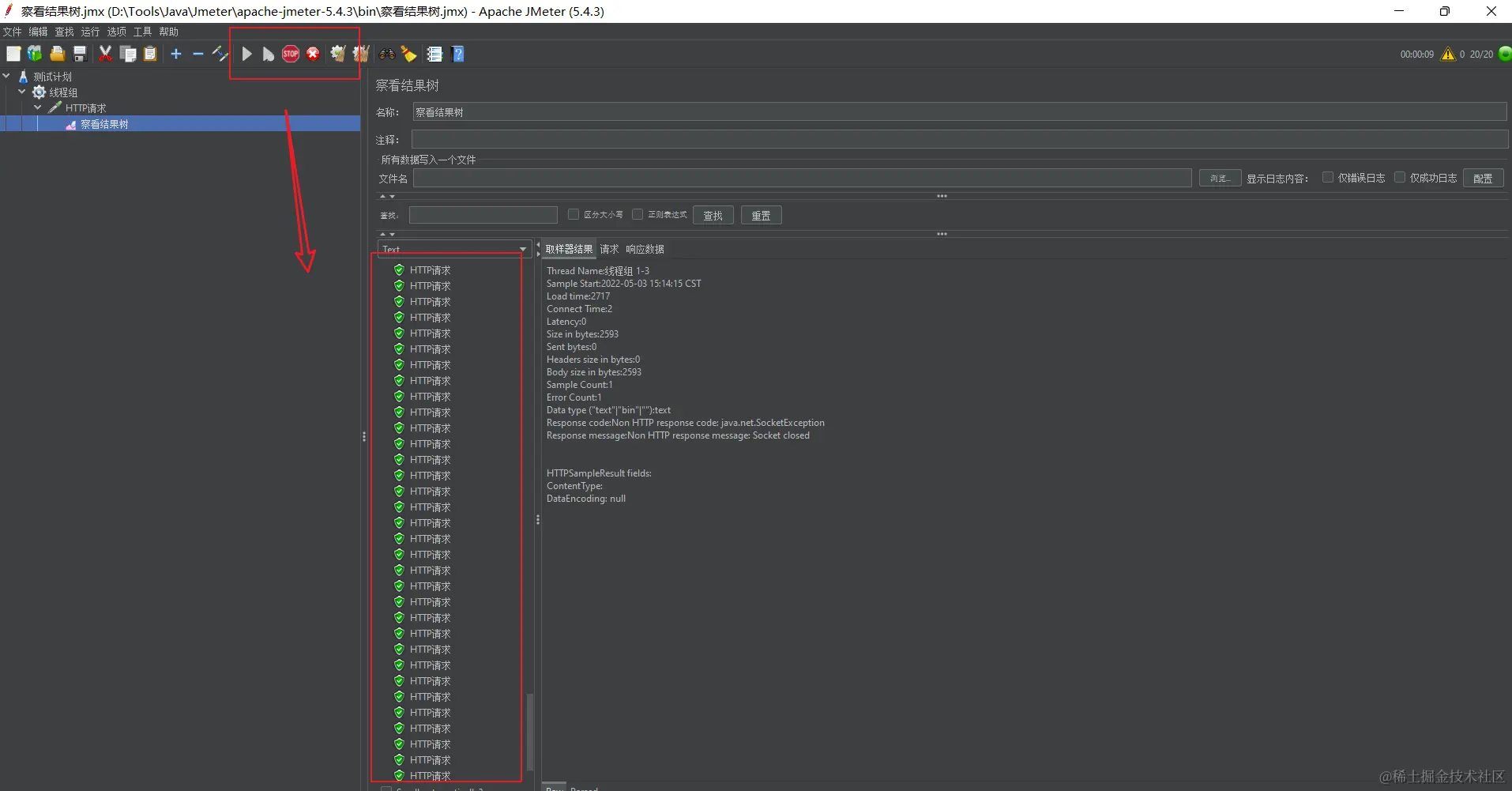 发现jemter已经启动成功并且已经发送了大量请求,绿色表示发送成功