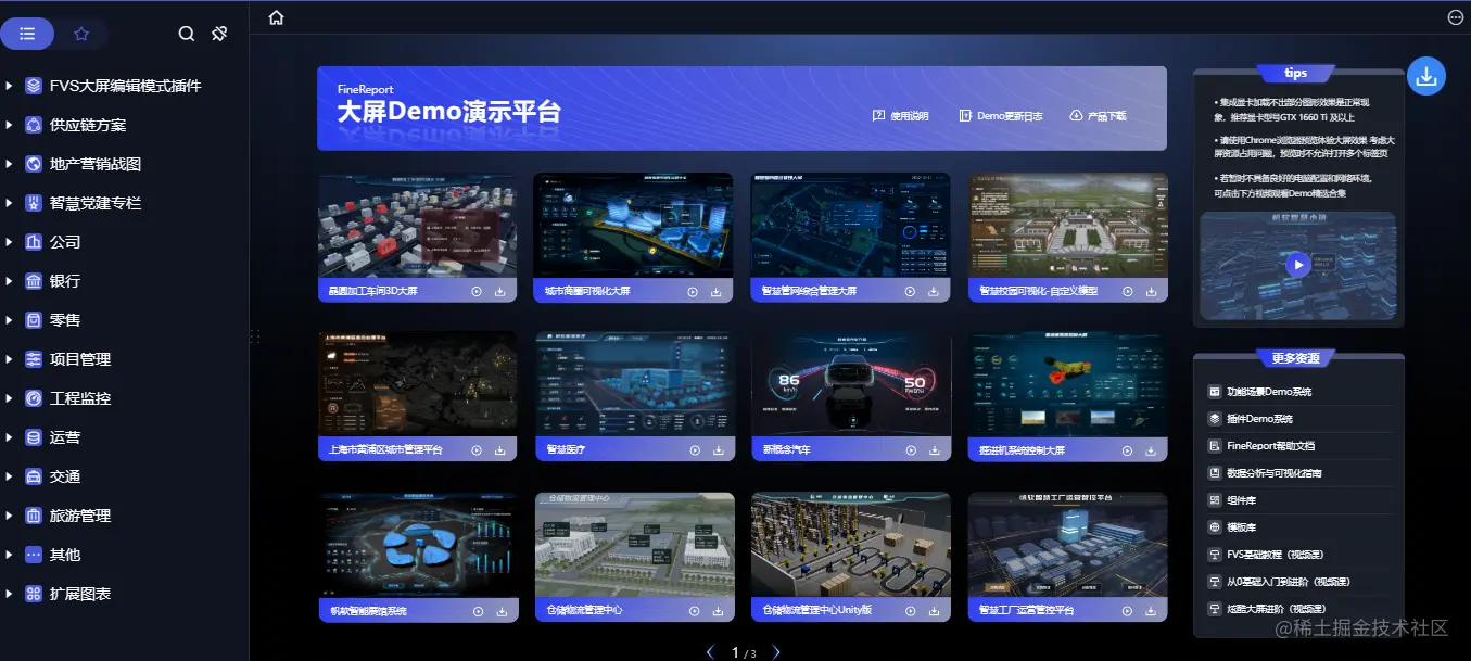 这款软件是专门做数据图像、三维处理、数据分析等相关业务,它通过图像可视化方式呈现数据分析,在智慧城市、工业监控用的比较多。不过这款软件是商业的,但是官网上有很多大屏设计,可以作为参考。