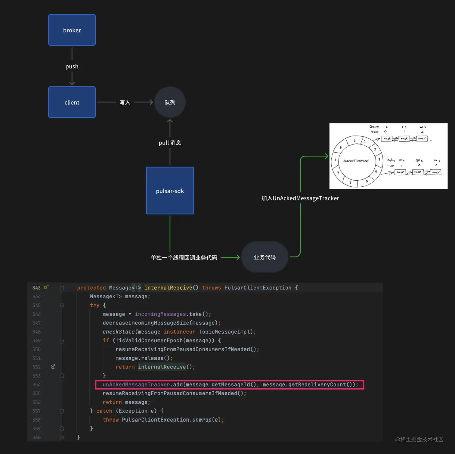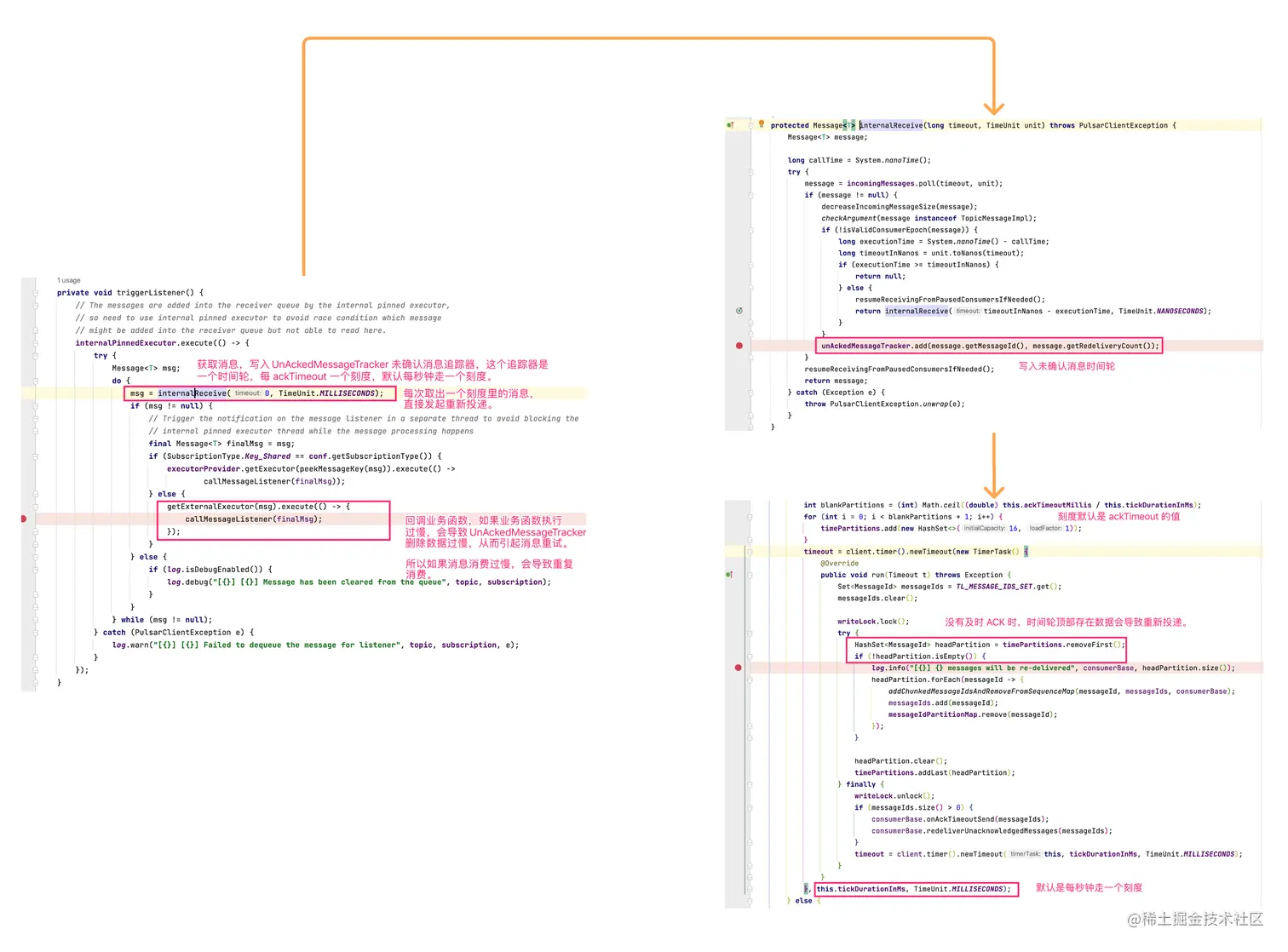messageListener异步消费并配置ackTimeout,每当从队列里获得一条消息后便会把这条消息加入UnAckedMessageTracker内部的一个时间轮中,定时检测顶部是否存在消息,如果存在则会触发重新投递。 4.1 加入时间轮后,异步调用我们自定义的事件,这个异步操作是提交到一个无界队列中由单个线程依次排队执行(这点是这次问题的关键) - 业务 ACK 的时候会从时间轮中删除消息,所以如果消息 ACK 的足够快,在第四步就不会获取到消息进行重新投递。