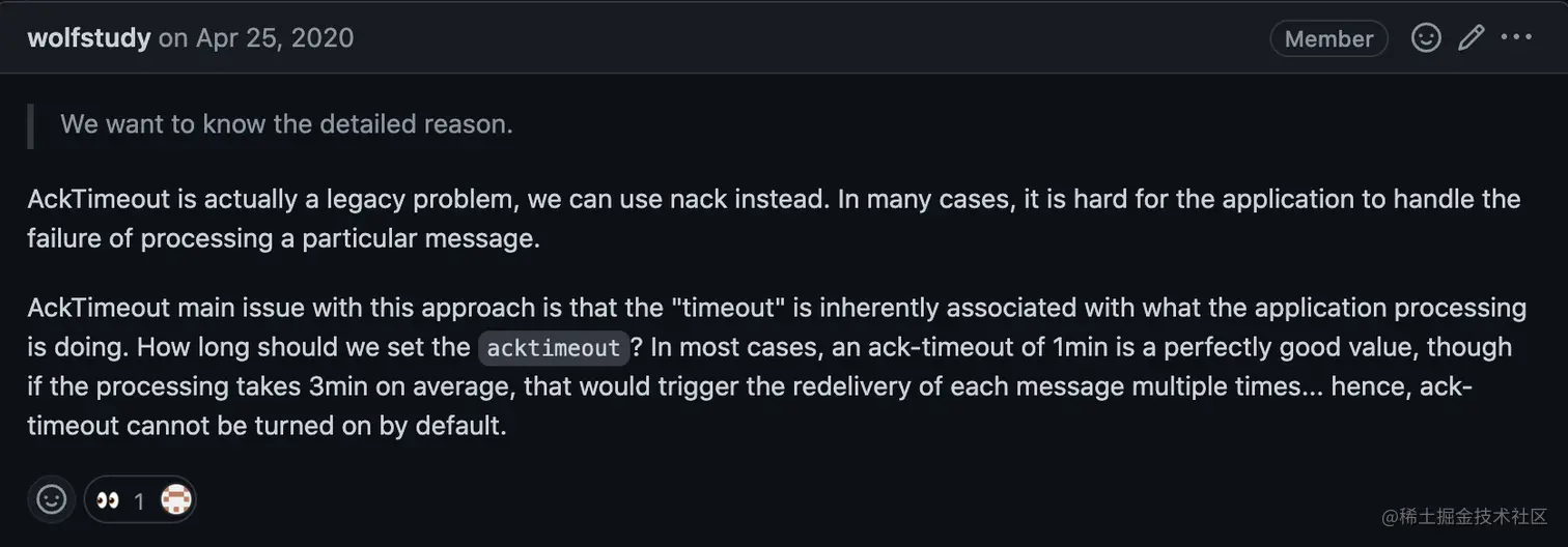 其实业务中并不推荐使用 ackTimeout 这个配置了,不好预估时间从而导致超时,而且我相信大部分业务配置好 ackTImeout 后直到后续出问题的时候才想起来要改。