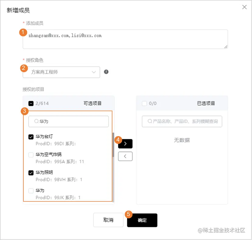 步骤5:在弹出的窗口中添加成员,选择授予的角色和项目,并单击“确定”。