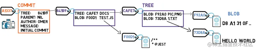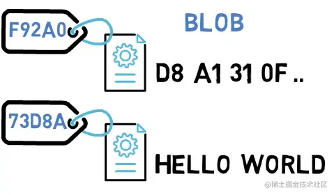 在 git 中,文件的内容存储在一些被称为 blob (二进制大对象)的对象中。blob 与文件的不同在于,文件还会包含元数据(meta-data)。例如一个文件会“记住”它的创建时间,如果你把它移动到另一个目录,它的创建时间是不会改变的。