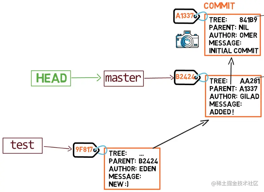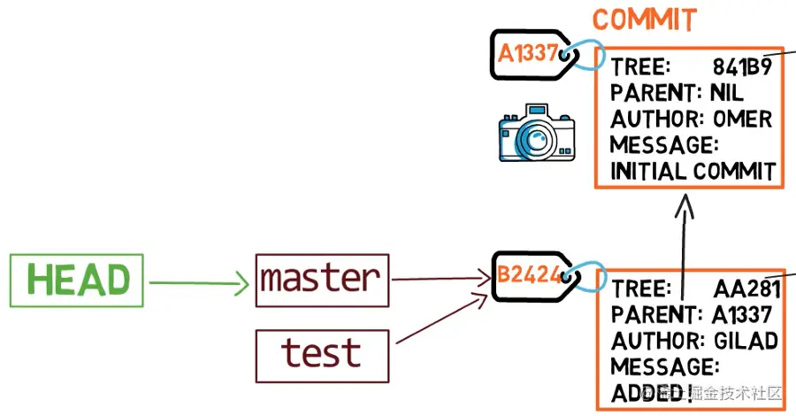 我们通常使用 git branch 命令创建一个新分支,而我们实际创建的却是另一个指针(pointer)。假设我们使用 git branch test 命令创建了一个名为 test 的分支,我们实际上是创建了另一个指针,它指向当前分支上的同一 提交。