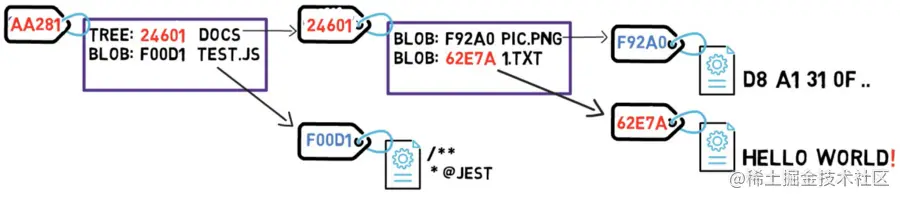 树对象 也用 SHA-1 哈希值唯一标识,它通过其它对象(blob 或 树对象)的 SHA-1 哈希值引用它们。