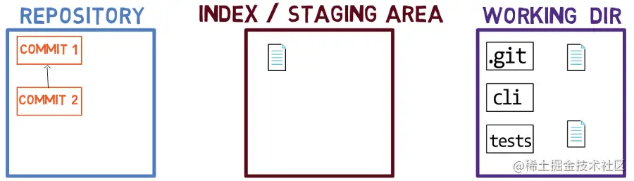 你可能使用过的其它和 git 类似工具,但是 git 并不会像其它工具那样直接将变化从 工作树 提交到 仓库。相反,它会先把这些变化注册到一个被称为 索引(index) 或 暂存区(staging area) 的地方。