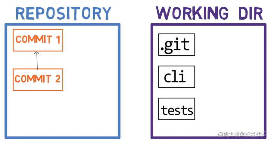 通常,我们在 工作目录(working dir) 中编写源代码。工作目录 (或 工作树(working tree) )可以是文件系统上的任何一个目录,它关联着一个 仓库(repository) 。目录内不仅包含工程的文件夹和文件,还包含一个名为 .git 的目录。稍后我们会再讨论 git 这个目录。