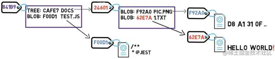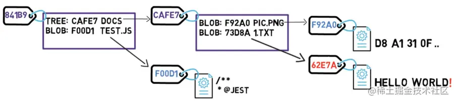 注意 CAFE7 这个 树对象 指向了 blob F92A0,在另一个 树对象 中,同一个 blob 可能会有不同的名字。