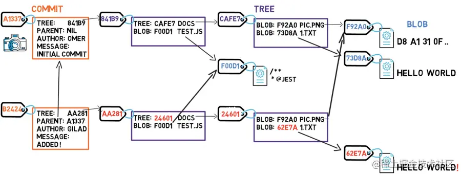 实际上,一些对象(尤其是 blob 对象)相比起之前的提交来说没有任何改变——blob F92A0仍然原封不动,blob F00D1 也一样。