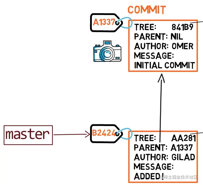 由于这次 提交 不是第一次 提交,所以它有一个父节点——commit A1337。