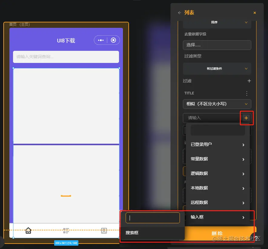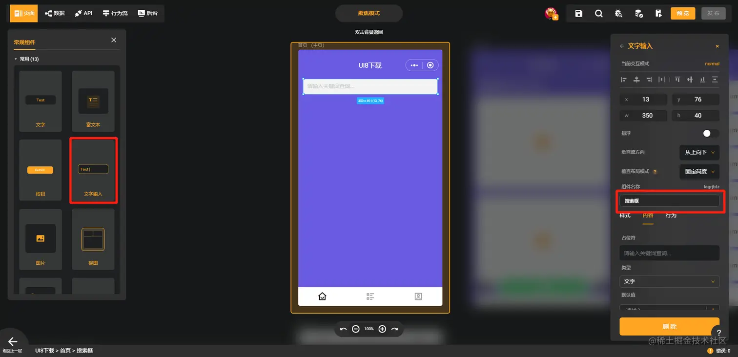 在页面中拖入一个“文字输入”组件,并且命名为“搜索框”,命名的作用是为了更方便的识别组件。