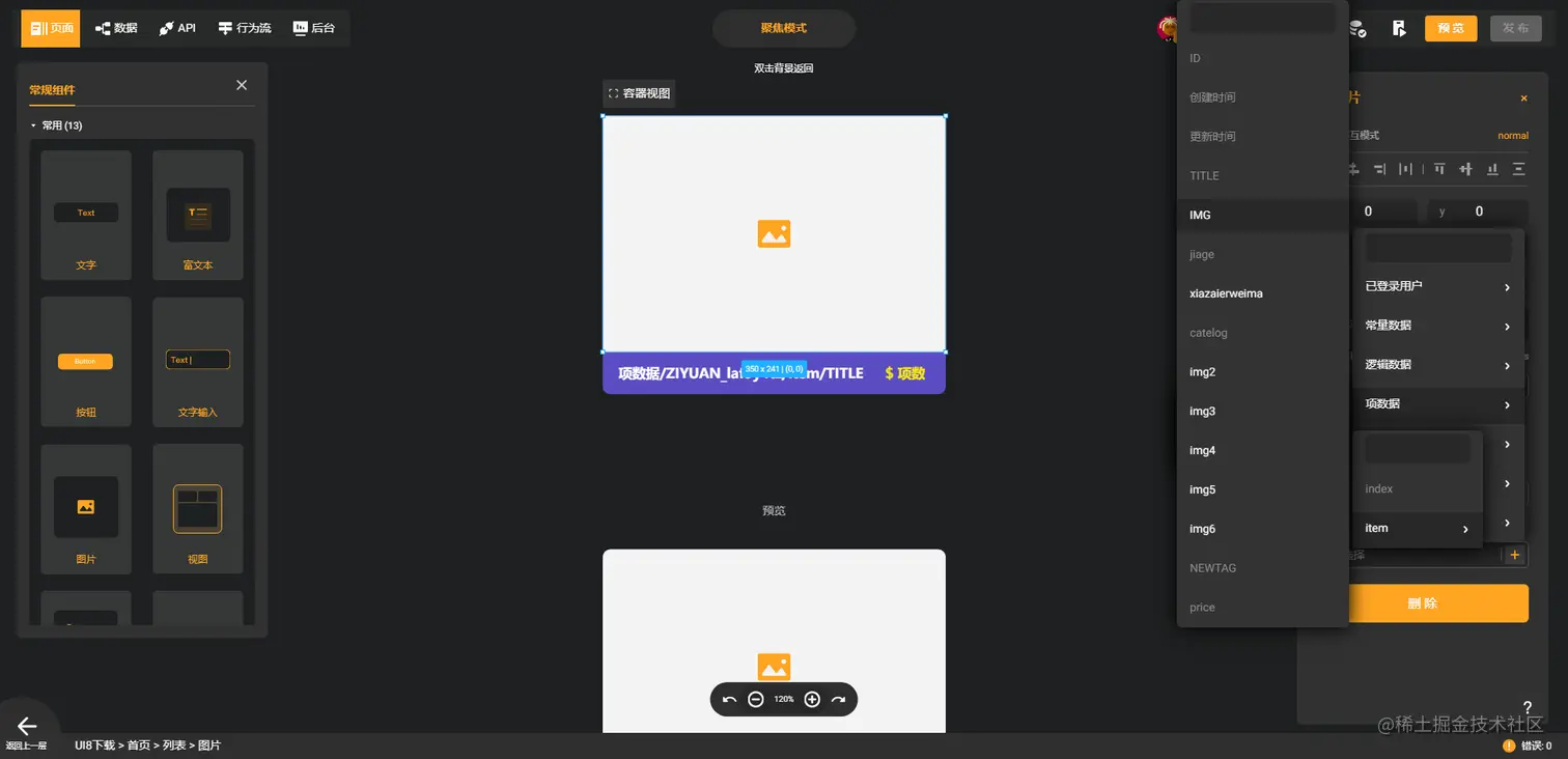 选中图片组件后,设置图片数据的来源,依次点击右侧橙色“+”,依次选择“项数据/绑定的表/item/图片字段”