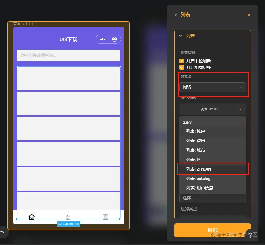 选中列表,在右侧面板中,数据源选中“网络”,在“哪个列表”下拉框中选择可以提供数据来源的表,这里以“ZIYUAN”表为例,这个表包含了图片、标题。等字段