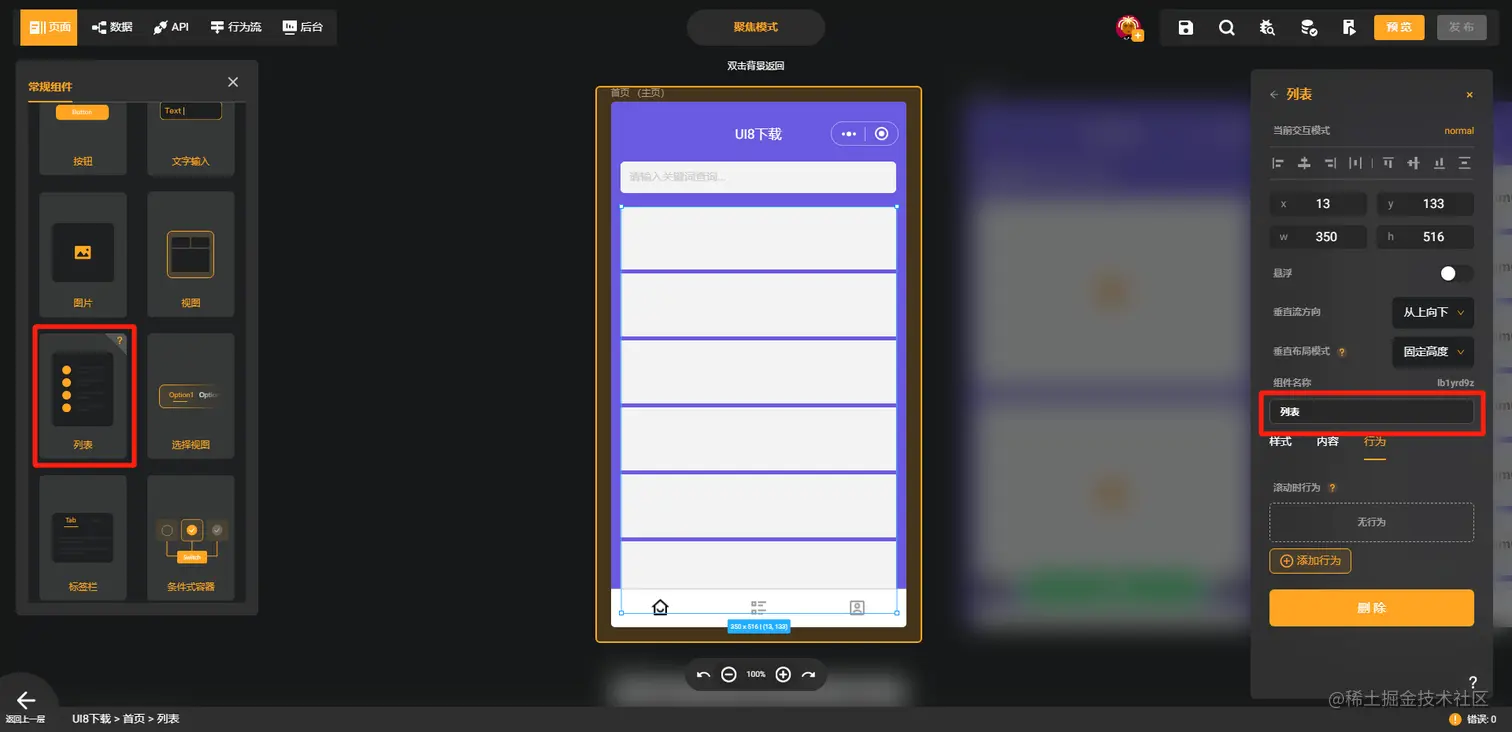 在搜索框下方放置一个“列表”组件,用于来展示列表数据。