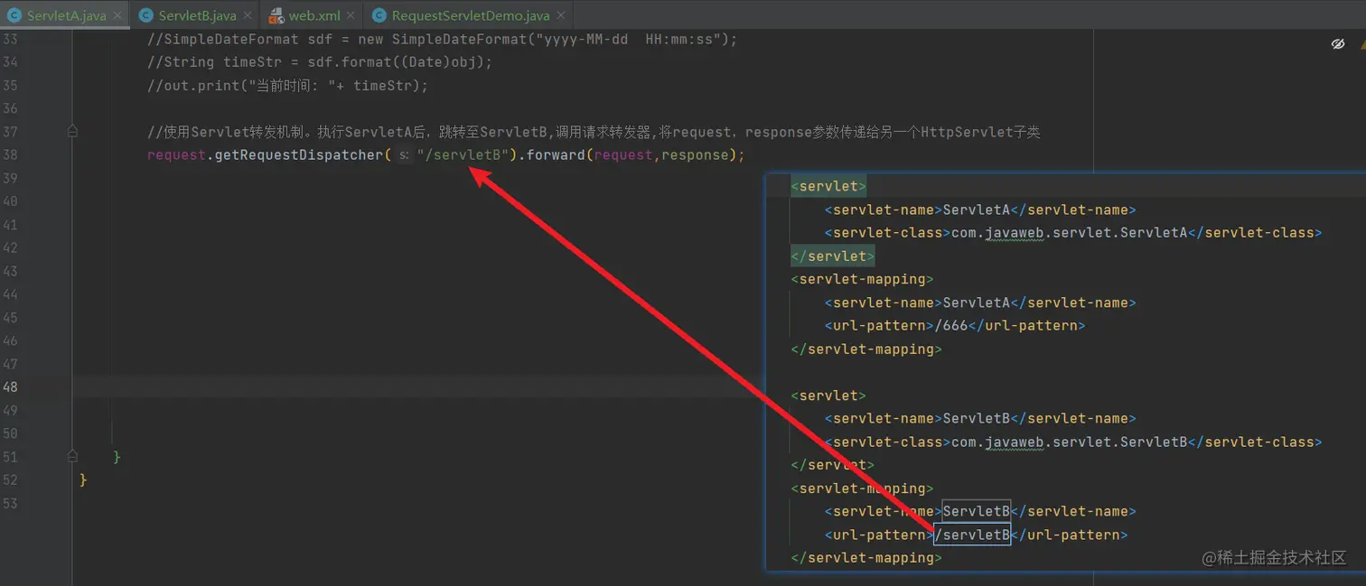 request.getRequestDispatcher("/servletB").forward(request,response);