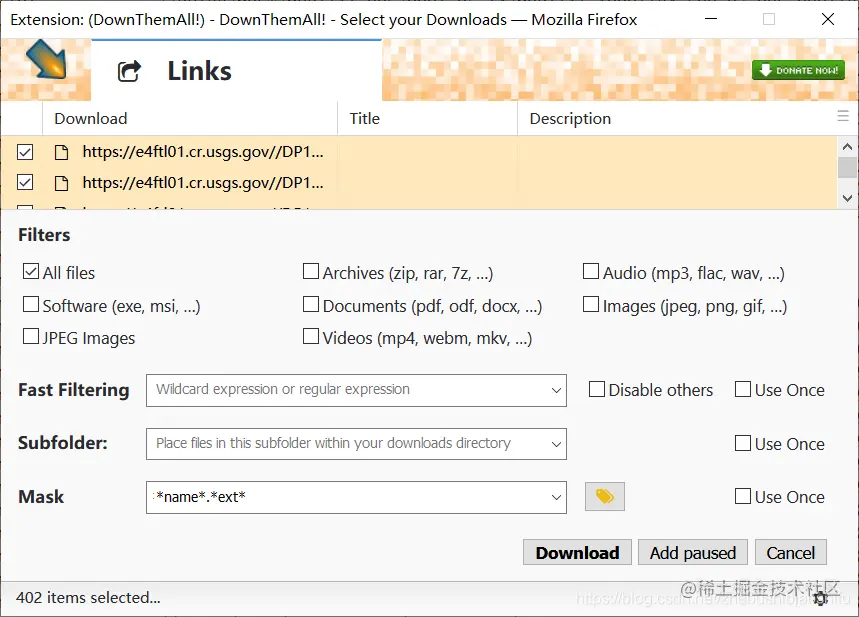 随后,在浏览器导入后的.txt界面中右键,选择“DownThemAll!”→“DownThemAll!”。