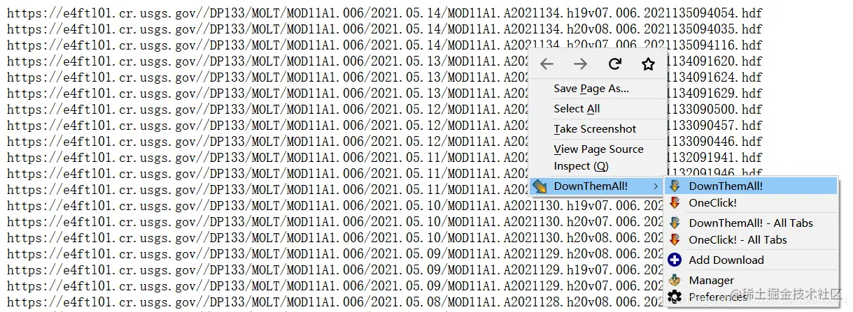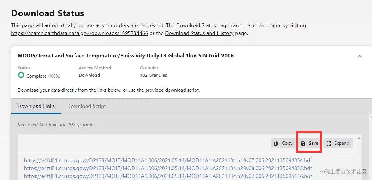 点击“Download Data”,等待链接全部生成后,选择“Save”,将所有影像文件的下载链接导出到一个.txt格式文件。