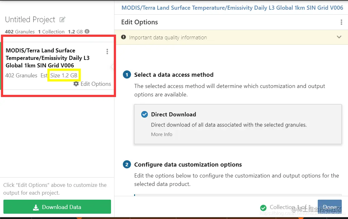 此时可以看到,我们的数据已经准备好。其中,如果需要下载多种产品类型的数据,一定要在左侧产品类型处逐个选择并下载,否则容易重复下载。此外,其中的黄色框内是数据的大概大小,有时候这个数据会与实际大小差的很多,大家参考即可。