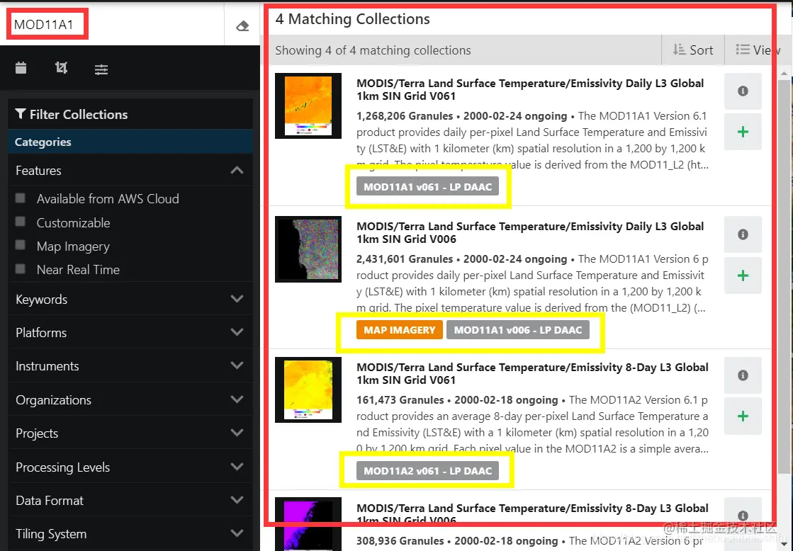 随后,在左侧的搜索框中输入我们需要下载的产品名称;本文就以MOD11A1产品为例介绍。搜索后对应匹配的产品类型结果会出现在右侧,其中黄色部分是我们需要进行注意的位置,也就是不同的产品类型和版本。