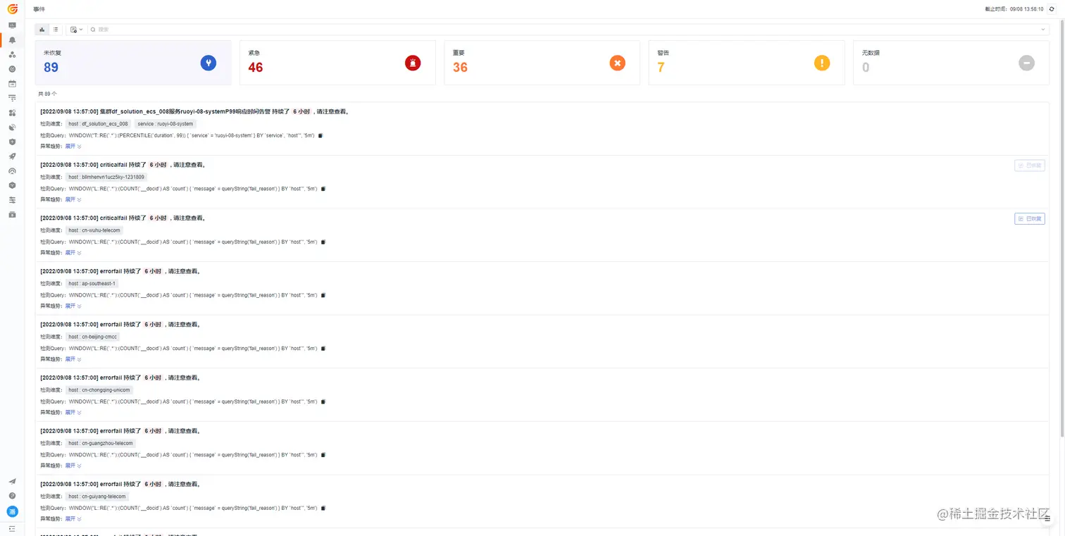 注意:恢复告警事件不受告警沉默限制。若未设置恢复告警事件检测周期,则告警事件不会恢复,且一直会出现在「事件」-「未恢复事件列表」中。