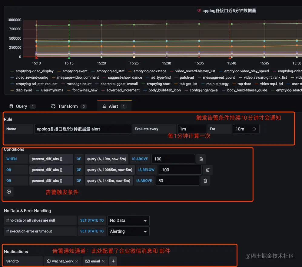 但是 Grafana 的告警的触发条件主要以指标的频率与既定的阈值比较为主,对于离群检测、突变检测等高级高级项相对缺失。