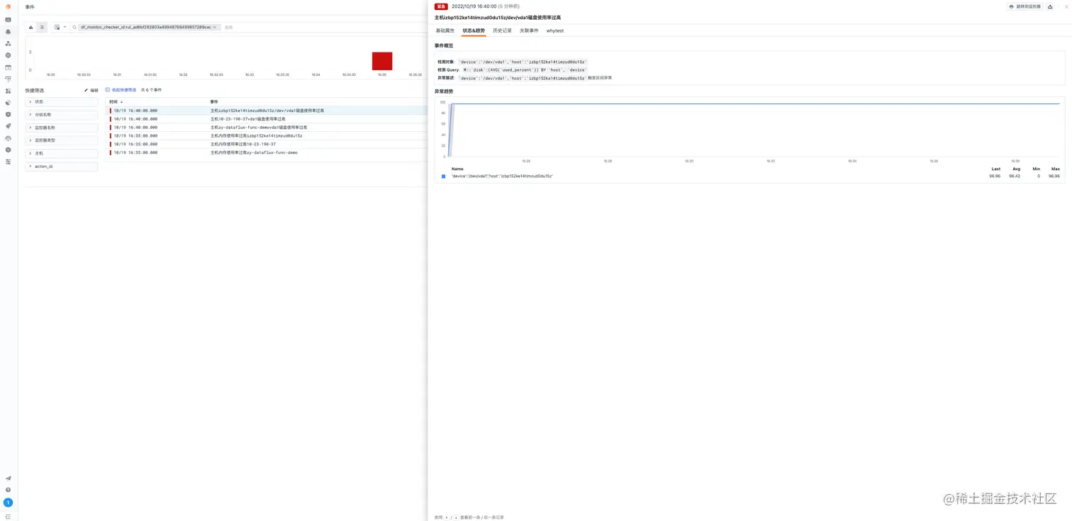 当在某些业务场景下当业务出现异常时可能会导致磁盘使用率出现异常,或者时有其他应用写入出现错误时时也可能导致磁盘使用率出现变化,这里以检测磁盘使用率区间异常为例,当发现磁盘使用率快速升高超出区间时就要及时来排查当前 host 可能影响业务的进程了。