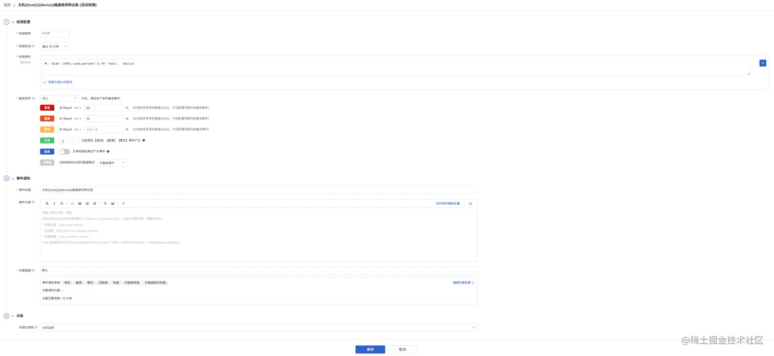 - 检测区间:为了更好的检测磁盘使用率的异常增长,检测区间采用获取近 15 分钟的数据作为检测基础来分析异常(可以根据业务重要程度来动态调整)