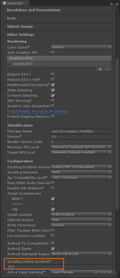 - 在 Unity 里,如果按上面操作来加条件编译符号是 无效 的,再次打开 VS 会发现恢复默认值。官网有介绍加在哪里,即 Project Settings -> Player 设置面板中的 OtherSettings -> Configuration -> Scripting Define Symbols 栏,即下图橙框处,这里我加的是