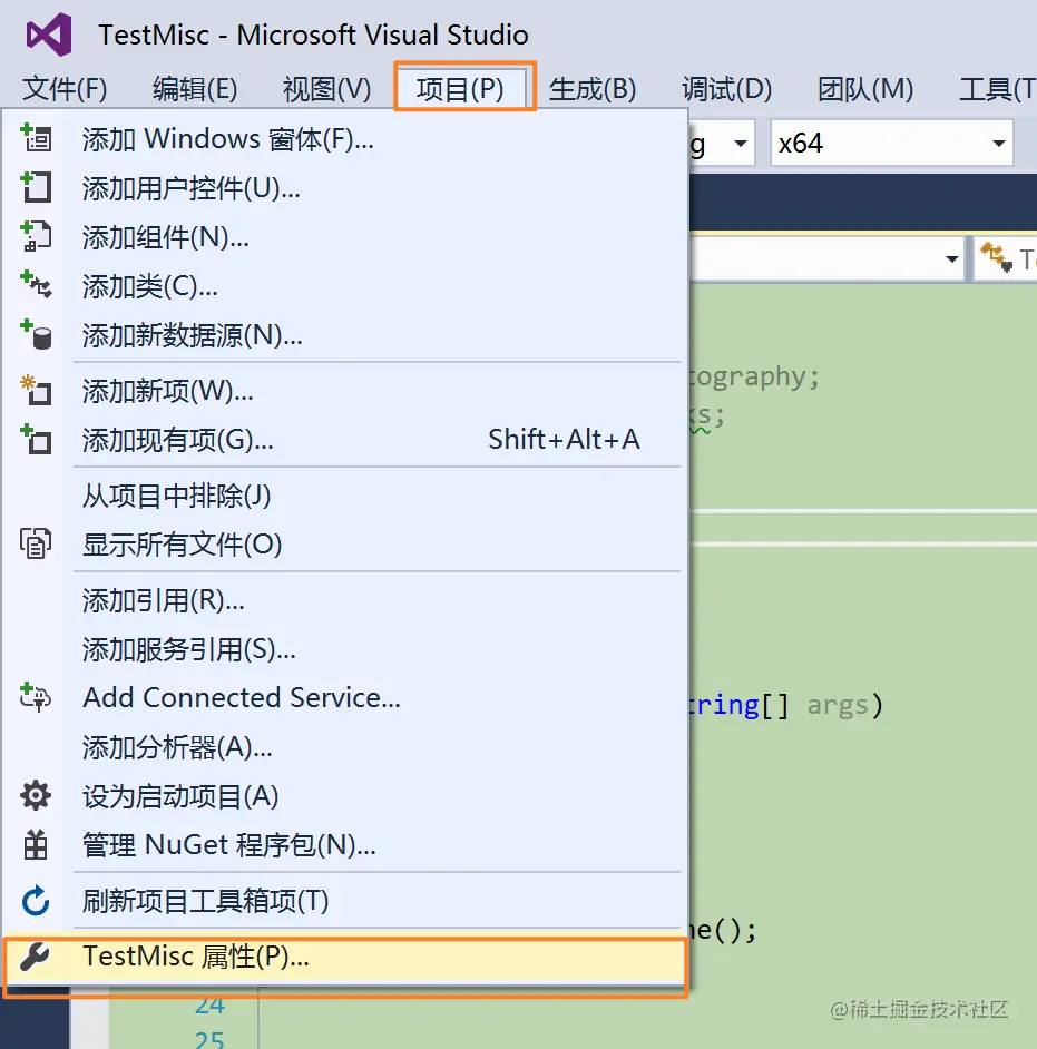 - 以 VS 工程 TestMisc 为例,打开项目属性面板,如下图(项目->TestMisc 属性)。
