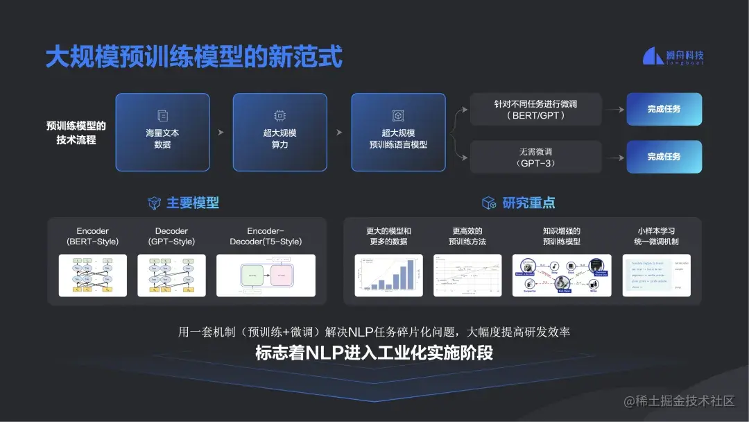 此次提到的大模型是一个预训练模型。什么是预训练?就是对互联网公开的、海量的数据去做无监督的训练,从而让模型对特定任务的学习变得轻松。而不是传统的靠人去做标注。好处在于,模型的水平已经提得很高,落地时就会基于某一个垂直领域的数据,或者某一客户的数据,只需做微调,落地就非常敏捷了,这时候客户要提供的数据比传统机器学习从 0 开始做一个模式要更快。也就是说,预训练模型标志着 NLP 进入了工业化实施阶段,可以核算成本,也可以作为生意,客户也能看到价值。