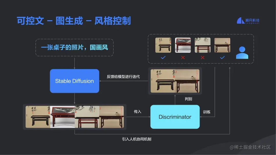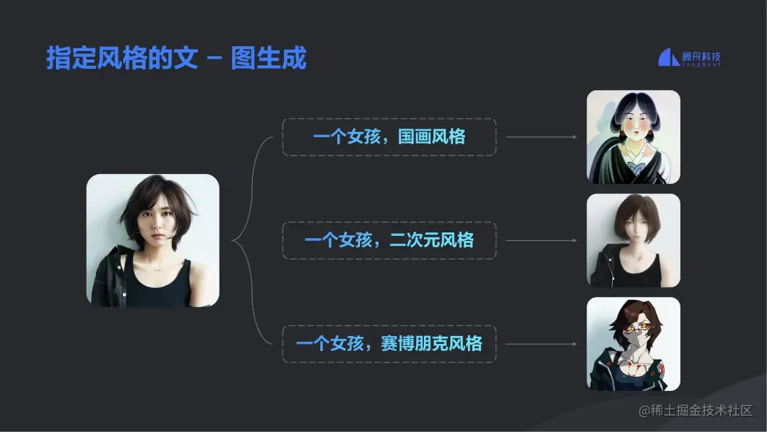 目前,澜舟科技也有一些初步的研究成果,比如可控的文图生成的风格控制,举个例子,生成一种国画风,也是用到 Stable Diffusion,但中间也会做一些训练进行反哺,就是有一个 Discriminator 判别器,中间有人员参与挑选生成的图片,然后告知模型生成的图片中有哪些是符合国画风的,哪些是不符合的,即把正确的结果再反哺给 Stable Diffusion ,如此训练出来的模型再去推理时,效果就会接近想要的风格。再比如,一张女孩子的图片,还可以指定风格生成二次元、国画、赛博朋克等不同风格的需求。