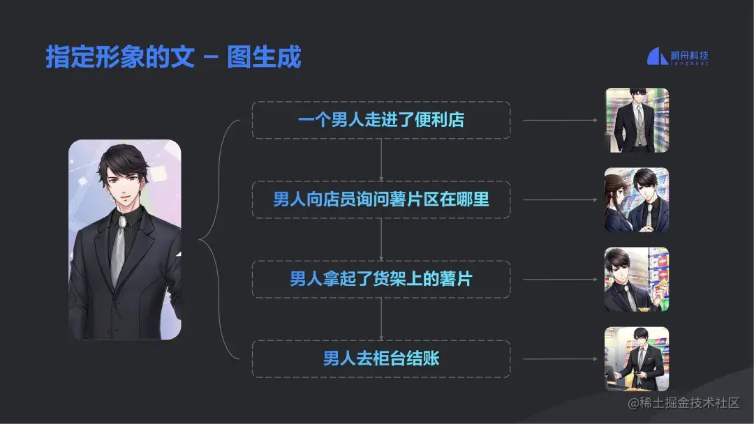 再拿形象控制来说,比如小说故事中的人物必须长成描述的样子,给定目标形象,但训练时也怕会出现拟合,需要把一些泛化的形象塞到模型中。为此,澜舟采用的是 DreamBooth 的方法,即拿一个字符去代表某一种男孩的形象进行训练,当进行推理时,只要告诉模型要推理这个字符形象的男孩,就能得到想要的效果。比如,一个男生走进便利店,他会出现在询问店员、拿商品以及结账等场景中,当然现在还会有一些瑕疵需要后续不断完善。
