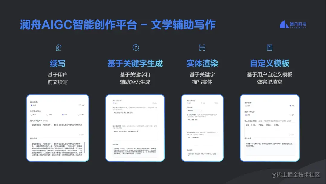 1、文学辅助写作场景。澜舟与中文在线、17K 小说等网文平台合作过程中听到许多实际的需求,为此,澜舟也提供了 4 类服务: