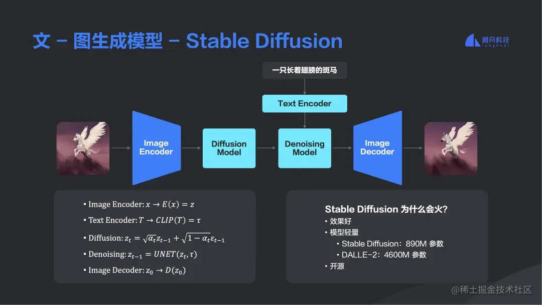 3、基于情节配图。虽然澜舟科技主打不是做图,但文、图有很多相通性,尤其是在模型底层向量化之后,无论是文字、语音还是图片,可比性和相似度变得非常的容易。澜舟科技在 文-图生成模型 Stable Diffusion 基础上进一步做垂直领域的落地,这里面分了几个模型,有图像编码、解码以及中间去噪的一个模型。如下图所示,左边是一个飞马,右边一个飞着的斑马,中间加的字就是飞在天上的斑马,最后飞马身长多出来“黑色条纹”变成了斑马,因此,文字进来也会进行编码,进去到去噪的模型中,大概就是这么一个原理。