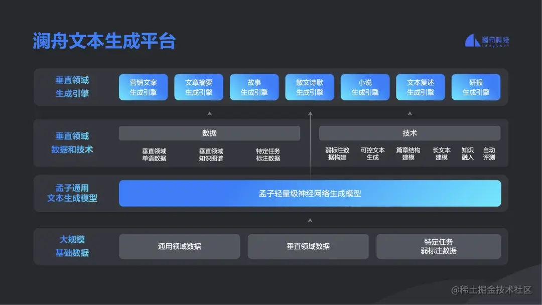 以上两个场景都是文本生成类应用,可以看到澜舟科技作为一个平台,它的底层是大模型以及算法、技术和数据等等,在具体领域中落地时,会有不同垂直领域的数据,这时候就出现了分支,还有一些针对文本生成相关的句子,最后都会归纳成澜舟文本生成平台。