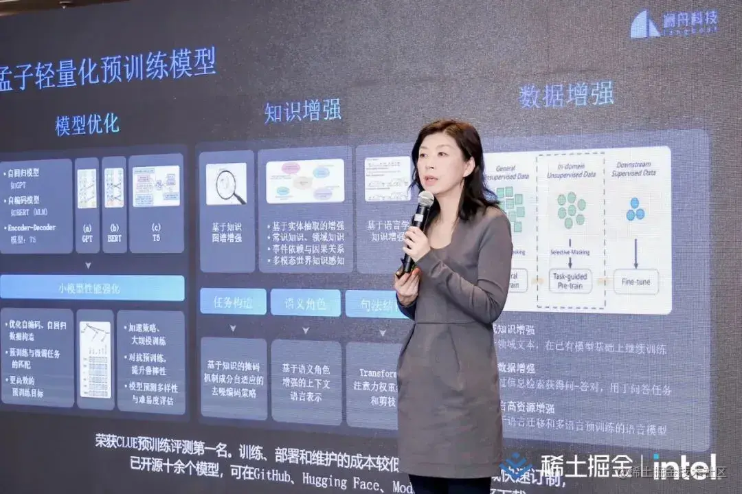大会上,澜舟科技合伙人、首席产品官李京梅介绍了澜舟科技的孟子轻量化预训练模型,及其已经在 GitHub、 Hugging Face 以及 ModelScope 等多个社区开源,提供近 20 个模型,涉及阅读理解、文本生成、多模态、金融等等各个方面,企业均可以下载使用。