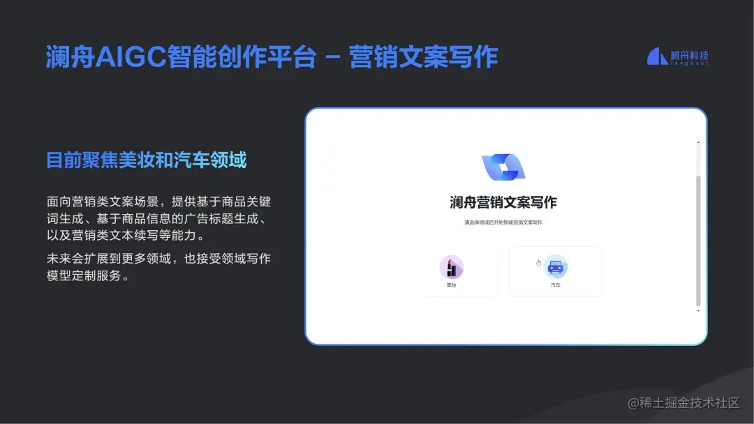 2、营销文案写作场景。营销文案其实是澜舟做得较早的一个落地应用,目前聚集美妆和汽车领域。用户可以从两个领域中进行选择,系统中有写内容、生成题目、改写等等方面,但都需要用户给到一定的关键字。到这里,大家会发现对于模型、技术而言,写什么都比较类似,关键在于在不同领域中,澜舟有不同的数据,所以关键词不一样,也就很快能适配到不同的应用的领域,但背后的技术是相通的,不用重新做一个完全不同的技术体系。比如,汽车领域中,可能涉及到一些专业的知识图谱,有品牌、有款型等等,当然,这只是一个体验,依然有不足指出,但如果有定制合作的需求,效果肯定比线上的试用 demo 更好。