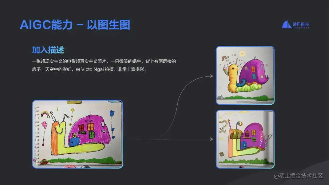 那么,澜舟科技具体在 Stable Diffusion 基础上做了什么?首先是文到图生成,比如,给小说中的一段话配图;其次是以图生图,比如,一位小朋友想要画这样一幅画:一只蜗牛,背上背着一栋房子,天上有彩虹。但小朋友画不好,那么,基于小朋友的画可能有不同画风的 AI 生图;最后是以文控图,比如,先生成一张“一个穿裙子的小女孩”的图片,在此基础上,还可以是在唱歌、在跳舞、在拉小提琴等等,通过文字再次控制原图片生成。
