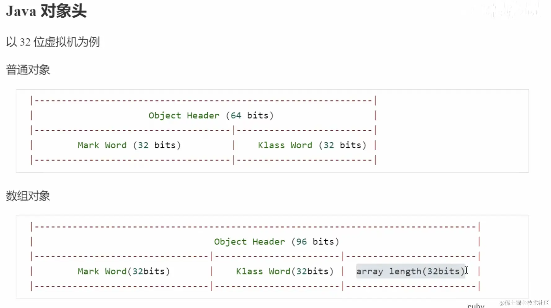其中对象头包含3个部分:Mark Word;指向类的指针;数组长度(如果当前对象不是数组则没有此部分