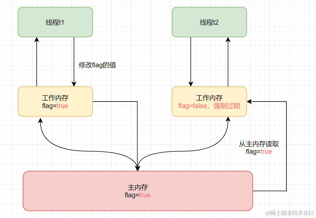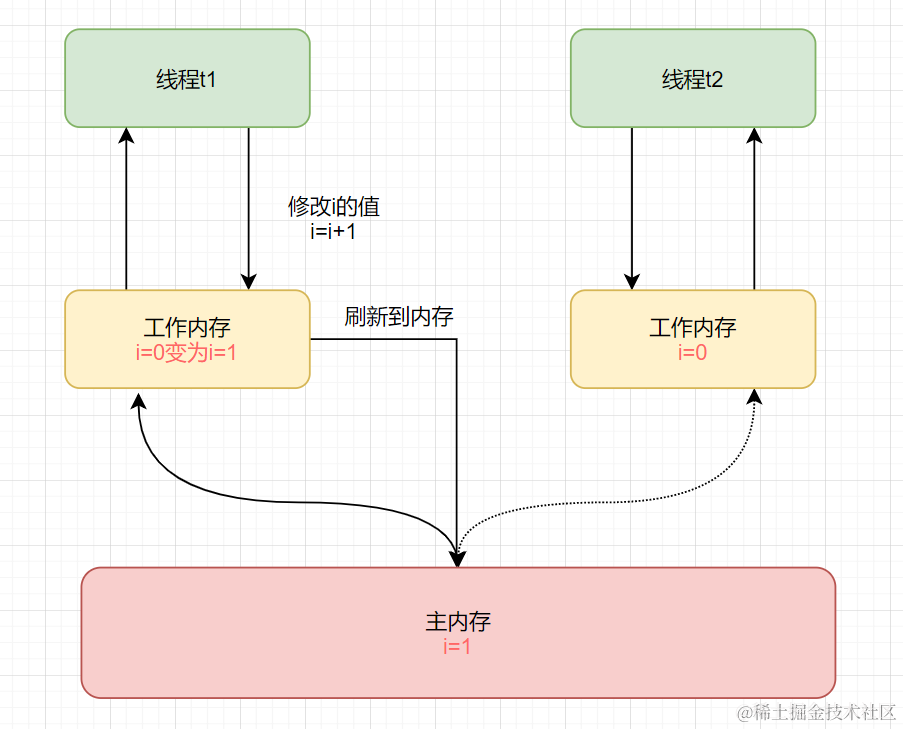 首先,执行线程t1从主内存中读取到i=0,到工作内存。然后在工作内存中,赋值i+1,工作内存就得到i=1,最后把结果写回主内存。因此,如果是单线程的话,该语句执行是没问题的。但是呢,线程t2的本地工作内存还没过期,那么它读到的数据就是脏数据了。如图: