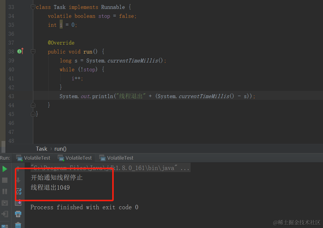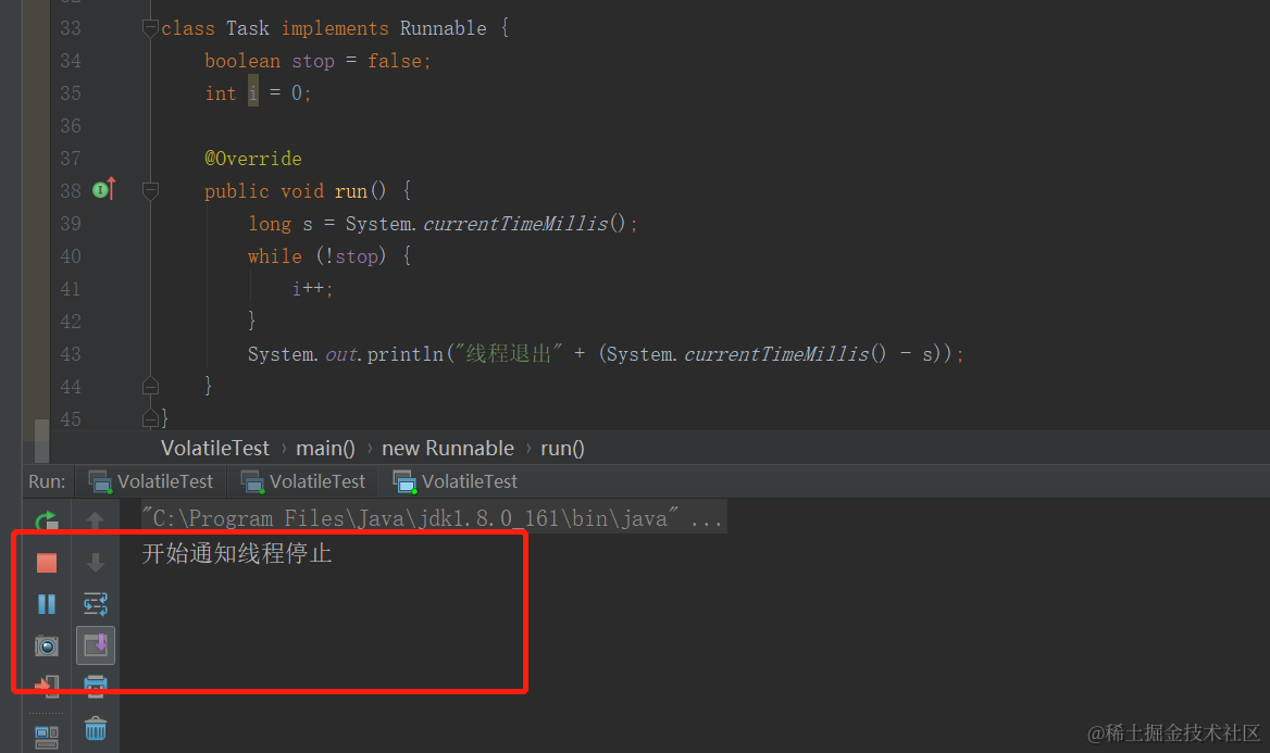 可以发现线程t2,虽然把stop设置为true了,但是线程t1对t2的stop变量视而不可见,因此,它一直在死循环running中。如果给变量stop加上volatile修饰,线程t1是可以停下来的,运行结果如下: