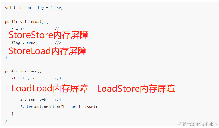 有些小伙伴,可能对这个还是有点疑惑,内存屏障这玩意太抽象了。我们照着代码看下吧(LoadLoad内存屏障也是在flag后面哈,图片有误):