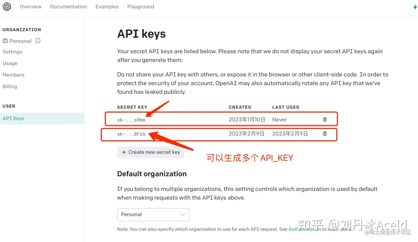 这里面需要一个api_key,api_key的获取办法是,首先要注册OpenAI账号,如果您之前已经可以使用OpenAI产品,说明你已经有了账号,然后在platform.openai.com/account/api… 网页中,生成API_KEY即可。