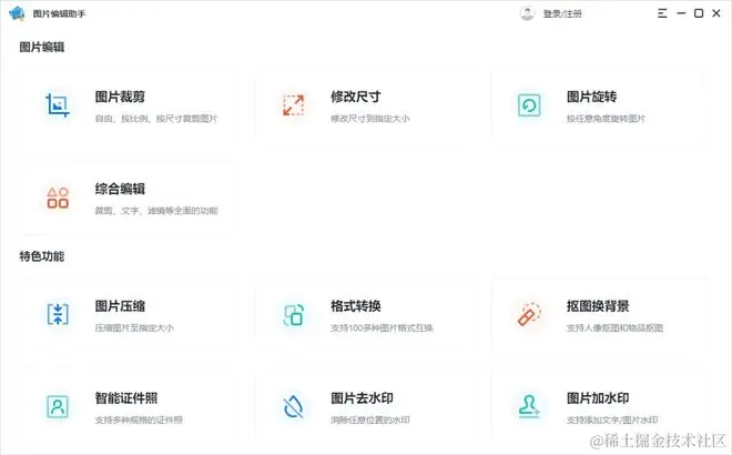它里面拥有丰富的图片编辑功能。分别有:图片裁剪、缩放、旋转、文字、边框、滤镜、抠图、去水印等操作。并拥有图片批量转换、图片压缩等功能。非常实用。